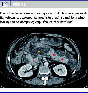 Den morfologiske beskrivelse af sygdommen AP baseres primært på fund gjort ved kontrastforstærket (contrast enhanced ) computertomografi (CECT) [16] (Figur 1 ). Herved kan der defineres tre specifikke sygdomstyper: 1) interstitiel, ødematøs pankreatitis (IEP), 2) nekrotiserende pankreatitis (NP) med nekrose af pankreasparenkymet (samt ofte tillige de peripankreatiske væv) og 3) NP med nekrose af udelukkende de peripankreatiske væv. Atlantaklassifikationen beskrev kun de første to sygdomstyper, hvorimod den isolerede peripankreatiske fedtnekrose, som ses hos op til 20% af patienter med svær AP, ikke blev omtalt som en selvstændig sygdomsenhed. Prognosen for sidstnævnte er generelt bedre end for patienter med intrapankreatiske nekroser [17], men udbredte peripankreatiske nekroser kan, specielt ved komplicerende infektion, også være livstruende.