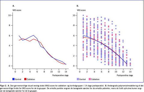 Postoperativt har vi ikke kunnet påvise nogen signifikante forskelle mellem de to grupper. Som det fremgår af Figur 2 , var der umiddelbart postoperativt en tendens til færre smerter i Co-gruppen end i kontrolgruppen, hvilket stemmer overens med de kliniske observationer, men dette var ikke signifikant. For begge grupper genfindes det velkendte fænomen, at smerterne tiltager på 4.-6.-dagen, en tendens som dog er mere udtalt for kontrolgruppen.