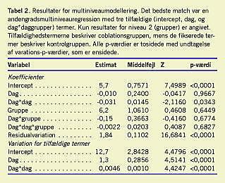 sidet, parret t-test. Hvor kravet om tilnærmelsesvis normalfordeling ikke var opfyldt, blev de to grupper sammenlignet ved Wilcoxon matched pairs signed rank sum test . Data vedr. VAS-score består af gentagne målinger af samme variable på samme patienter, hvorfor man må forvente autokorrelation. Yderligere er gentagne sammenligninger af VAS-score for hver postoperativ dag problematiske. Derfor har vi anvendt multiniveauregressionsmodeller til sammenligning af det tidsmæssige forløb for VAS-scoren for de to grupper [3, 4]. Selve beregningerne er foretaget med MIXREG [5]. Til sammenligning af forskellige mulige modeller har vi anvendt log likelihood-ratio (LL) χ2 -test.