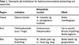Inden for de seneste år har anvendelsen af Clostridium botulinum -neurotoksin type A åbnet nye muligheder for behandling af spasticitet. Virkningsmekanismen i spastiske muskler er ikke kendt med sikkerhed. Botulinumneurotoksinet bindes specifikt til receptorer på overfladen af det præsynaptiske neuron i motoriske endeplader. Her internaliseres neurotoksinmolekylet og udøver sin virkning ved spaltning af tre proteiner, der normalt medierer eksocytose af acetylkolin-holdige vesikler i synapsen. På denne måde blokeres acetylkolinfrigivelsen fra nervecellen irreversibelt, og musklen lammes. Ved intramuskulær injektion fordeler neurotoksinet sig inden for den pågældende muskel. Effekten indtræder 2-8 dage efter injektionen og varer i 2-4 (op til seks) måneder, mens den neuromuskulære transmission gradvis gendannes. Bivirkninger er sjældne og oftest relateret til uønsket diffusion af neurotoksinet til nabomuskelgrupper. Udvikling af antistoffer mod neurotoksinet er ligeledes sjældent forekommende, når behandlingerne foretages med minimum tre måneders interval. Den kliniske effekt af botulinumneurotoksin ved spasticitet er inden for de seneste år rapporteret i to dobbeltblindede, placebokontrollerede undersøgelser, og fundene blev bekræftet i en række åbne studier. Man fandt bl.a. effekt af behandlingen på variable som påklædning, ekstremitetsstilling, hygiejne, smerter og behov for gangredskaber. Eksempler på indikationer med dokumenteret effekt fremgår af Tabel 1 .