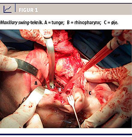 Pga. usikker histologi ved revision af det histologiske præparat fra rhinopharynx blev der foretaget en ny biopsi fra rhinopharynx. Denne viste papillært adenokarcinom. Strålebehandlingen blev derfor afbrudt, og der blev fundet indikation for kirurgisk intervention. Dette foregik i Hongkong med maxillary swing-adgang (Figur 1), hvor mellemansigtet svinges lateralt. Operationen var makroskopisk og mikroskopisk radikal, men frie rande på 5 mm kunne ikke opnås pga. den svært tilgængelige lokalisation. Patienten fik postoperativ strålebehandling efter DAHANCAs retningslinjer. Den endelige histologiske diagnose var polymorft lavgradsadenokarcinom.