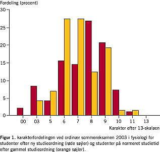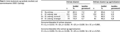 Materiale og metoder: Et anonymt spørgeskema blev postomdelt til de 272 studerende, der indstillede sig til sommereksamen i fysiologi i maj 2000. Beståelsesprocent, karaktergennemsnit og fordeling af karakterer blev opgjort for de 248 studerende. Dataene blev analyseret for forskelle mellem gammel og ny studieordning.