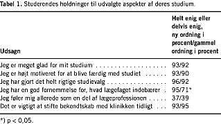 Resultater: Af de 72%, der besvarede spørgeskemaet, udtrykte 90% eller flere på både ny og gammel studieordning tilfredshed med studie og studievalg, motivation for at fuldføre studiet og tillid til værdien af tidlig klinisk træning. Signifikant flere studerende efter ny studieordning end efter gammel angav, at de havde fornemmelse for lægefaget (95% vs. 71%). Der var ingen forskel i beståelsesprocenten på hhv. gammel og ny ordning. Studerende på ny studieordning havde signifikant højere karaktergennemsnit end studerende på gammel ordning, men også signifikant højere adgangsgivende karakterer til studiet end studerende på gammel ordning.