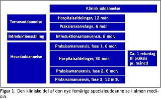 Inden for specialet almen medicin anbefalede man i Speciallægekommissionens betænkning, at uddannelsen burde forlænges fra tre et halvt år til fem år efter gennemført turnusuddannelse. Der er her tale om en meget markant styrkelse af kernen i vores uddannelse, og forslagene blev støttet af DSAM og P.L.O. ud fra, at faget almen medicin primært skal læres i almen praksis, hvor man møder de almenmedicinske problemstillinger. Kommissionen anbefalede desuden, at uddannelsen inden for de sygehusbaserede specialer, der indgår i uddannelsen i almen medicin, målrettes mod almen praksis. Figur 1 viser en skematisk oversigt over den kliniske del af den nye uddannelse. Den teoretiske del omfatter specialespecifikke og tværfaglige teoretiske kurser samt et forskningstrænningsmodul (se www.dsam.dk).
