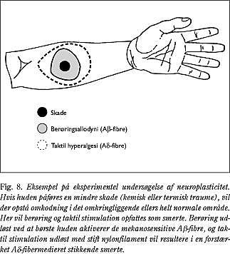 Allodyni kan observeres hos patienter med fx neurogene smerter eller omkring et eksperimentelt induceret hudtraume (brandskade eller kemisk påvirkning). Appliceres fx chilipeber (capsaicin) på huden, vil der i applikationsområdet efter en times tid opleves hyperalgesi (primær hyperalgesi) over for fx termal stimulation samt neurogen inflammation (6). Omkring dette område, hvor huden ellers ser normal ud, vil der nu udvikles allodyni (sekundær hyperalgesi) - smerte, der udløses ved fx at stryge en vatpind over huden. Lokalbedøves det primærhyperalgetiske område, så smerten blokeres, forsvinder allodynien. Tilsvarende ses hos patienter, at allodynien forsvinder, hvis årsagen til smerten (fx et neurom) blokeres. Sådanne eksperimentelle og kliniske modeller anvendes i stort omfag inden for basal smerteforskning (Fig. 8).