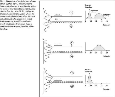 Det er velkendt, at kutan smerte kan opfattes som stikkende eller brændende, hvilket indikerer, at der er forskellige baner, som leder smerteimpulserne (Fig. 1). Den stikkende smerte ledes til rygmarven med en hastighed på ca. 10-20 m/s og den brændende med en hastighed på kun 1-2 m/s. Den stikkende smerte ledes ad de tynde myeliniserede Ad-fibre og den brændende smerte ad de umyeliniserede C-fibre. De to typer smerter responderer eksempelvis forskelligt på morphin, hvilket indikerer, at deres centrale terminaler også er forskellige. Responskarakteristikken og fyringstærsklerne for disse to receptorpopulationer er forskellige, og de seneste års forskning har vist, at der findes to subtyper af Aδ-nociceptorer og et antal (3, 4) subpopulationer af C-nociceptorer. Disse nociceptorer er normalt polymodale, dvs. at de responderer på forskellige kombinationer af kemisk, termisk og/eller mekanisk stimulation. Transduktionsmekanismerne (ionkanalkomplekser) (4) i receptorernes membraner er ikke velkarakteriserede, men i fremtiden kunne den perifere receptorer (fx opioid, N-methyl-D-aspartate [NMDA], alpha-amino-3-hydroxy-5-methyl-4-isoxazole propionic acid [AMPA] og gammaaminosmørsyre [GABA]) være et mål for nye smertebehandlingsprincipper (5).