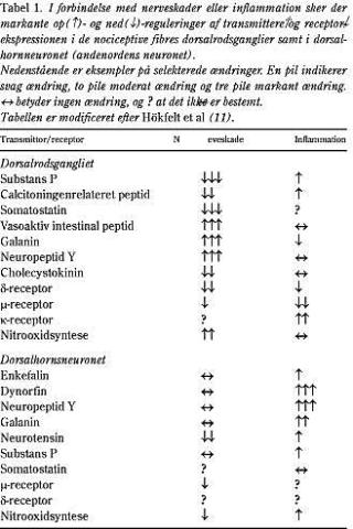 I forbindelse med skader på den perifere nerve sker der stor regulering i DRG-syntesen af excitatoriske og inhibitoriske peptider (Tabel 1). For eksempel forekommer der et reduceret niveau af substans P (og fx CGRP) i C-fibre, hvorimod der sker en opregulering af galanin (og fx vasoaktiv intestinal polypeptid [VIP]). Det viser sig, at en reduceret syntese af substans P i noceptive afferenter modsvares af en opregulering i Aβ-fibrene, hvilket kunne være af betydning for udvikling af allodyni.