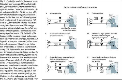 Der er således mindst fire måder, hvorpå rygmarvsneuroner kan omkodes, således at mekanisk berøring kan opfattes som smerte. Der er forskellige modeller for central sensibilisering, hvor normalt ikkesmerteførende, tykke, myeliniserede Aβ-fibre omkodes til at signalere smerte: 1) Hvis en C-fiber aktiveres intenst, vil det centrale projektionsneuron sensibiliseres pga. massiv frigivelse af glutamat, herved vil mekanisk aktivering kunne depolarisere neuronet og signalere smerte. 2) I tilfælde af inflammatoriske processer kan de mekanosensitive neuroner ændre fænotype, hvorved de eksempelvis begynder at udtrykke substans P og kommer til at ligne en C-fiber, som er i stand til at inducere central sensitisering. 3) I forbindelse med nerveskader sker spontan fyring fra C-fibre, der kan inducere central sensibilisering, ligesom de mekanosensitive neuroner kan ændre fænotype. 4) Mekanosensitive neuroners terminaler kan ændre termineringen fra de dybe til de mere superficielle lamina (Fig. 2).