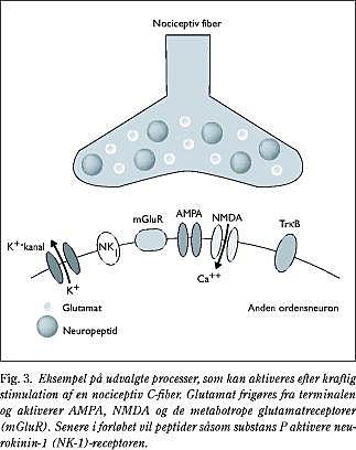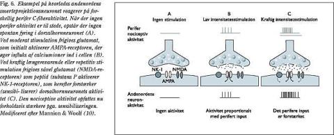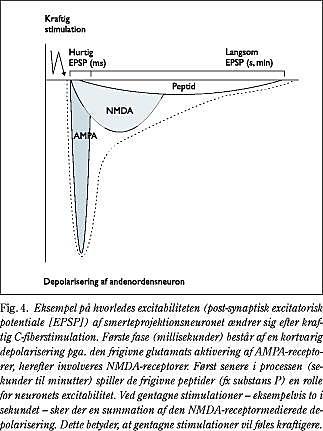 Et akut nociceptivt stimulus medfører frigivelse af glutamat (excitatorisk aminosyre) i synapsen, som initialt aktiverer AMPA-receptoren og depolariserer andenordensneuronet. Efter AMPA-aktiveringen vil NMDA-receptoren blive involveret, hvilket kan resultere i hyperalgesi/allodyni. Det ser ud som om, at AMPA-aktiveringen reducerer tærsklen for depolarisering af det nociceptive neuron, og at NMDA-aktiveringen medfører en øget respons ved kraftig stimulation, uden at excitationstærsklen ændres. Neurokinin (NK) og metabotrope glutamat (mGluR)-receptorerne aktiveres herefter (>100 ms) af henholdsvis den frigivne substans P og glutamat (11). Med henblik på smerteblokering har der været en naturlig interesse for i første omgang glutamatreceptorerne (Fig. 4).