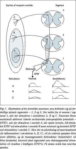 Samtidig med at neuronerne sensibiliseres, kan der ske en udvidelse af deres modtageområde - forstået således, at neuronerne nu kan depolariseres fra et større hudområde. Denne udvidelse af det receptive område kan skyldes effektivisering af synaptiske overgange, som normalt ikke reagerer på aktivering af et givet receptorområde (Fig. 7).