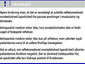 I neurofysiologiske undersøgelser er det igennem de seneste 20 år blevet dokumenteret, at spasticitet primært manifesterer sig i hvilende muskulatur, mens der oftest ikke er tegn på forøget refleksaktivitet i muskulaturen under bevægelse [5]. Den funktionelle betydning for generel indskrænkning af bevægelse må derfor betvivles. Samtidig har man i forskningen klart dokumenteret, at reflekser ikke findes som et separat fænomen, men er del af de samme neurale netværk, der styrer vore frivillige bevægelser [6]. En specifik behandling af reflekser uden en påvirkning af evnen til at udføre frivillige bevægelser er derfor ikke mulig. Endelig har man i nyere undersøgelser dokumenteret, at antispastiske medikamenter påvirker de mekanismer, der indgår i neuroplastiske forandringer i forbindelse med træning og indlæring, herunder fysioterapi [7]. Antispastisk medicinering kan således potentielt reducere effekten af samtidig fysioterapi og rehabilitering.