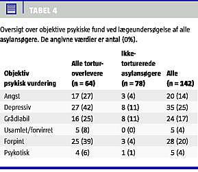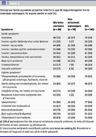 Summary Health status and degree of traumatisation among newly arrived asylum seekers in Denmark Ugeskr Læger 2010;172(2):120-124 An unknown number of asylum seekers arriving in Denmark have been exposed to torture. Amnesty International's Danish Medical Group examined 142 asylum seekers, of whom 45% had been exposed to torture. Physical and psychological symptoms were 2-3 times as frequent among torture survivors as among non-tortured asylum seekers. Among the torture survivors, 63% fulfilled the criteria of post-traumatic stress disorder, 58% had objective psychological findings, and 42% had torture-related scars. Identification of torture survivors is important in order to initiate the necessary medical treatment.