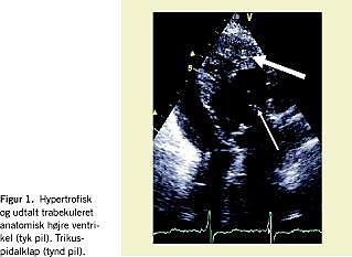 En 76-årig tidligere rask kvinde med et højt funktionsniveau blev akut indlagt med træthed, der havde varet i tre uger, samt svimmelhed og åndenød. Ved den objektive undersøgelse fandtes patienten normotensiv og kardielt velkompenseret. Pulsen var regelmæssig (61 pr. minut), og der kunne høres en styrke to systolisk uddrivningsmislyd over basis cordis. Elektrokardiogrammet viste sinusrytme med førstegrads AV-blok og QS-konfiguration i inferiore afledninger. Telemetri afslørede intermitterende andengrads AV-blok, Mobitz type 2 med ledsagende bradykardi (40 pr. minut). Ekkokardiografisk fandtes at venstre atrium via trikuspidalklappen førte til en hypertrofisk og trabekuleret højre ventrikel (Figur 1). Systemventriklens systolefunktion var let nedsat. Aorta afgik fortil i forhold til a. pulmonalis. Der fandtes let turbulent antegradt flow, som svarede til systemventriklens udløbsdel, men ingen obstruktion. Aortaklappen var trikuspid og let insufficient, men der var ingen stenose. Der var let trikuspidalinsufficiens, ingen ventrikelseptumdefekt eller pulmonal stenose. Patienten blev overflyttet til et center med landsdelsfunktion i kongenit hjertesygdom, og fik på indikationen symptomgivende andengrads AV-blok og kronotrop inkompetence ukompliceret implanteret en tokammer-pacemaker (DDD-modus). Efterforløbet var ukompliceret, og patienten blev udskrevet uden medicin. Ved opfølgende tremåneders kontrol var patienten symptomfri, og ekkokardiografisk fandtes der uændrede forhold.