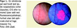 Incidensen af blæretumorer er stabil med omkring 1.700 nye tilfælde årligt. En af de nye metoder til tidligere at påvise carcinoma in situ (CIS) eller dysplatiske områder i blæren er instilation af 5-aminolevulinate eller hexaminolevulinat [4]. Indhældningen sker inden cystoskopien og en evt. transuretral resektion af blæretumor. . Mekanismen er en akkumulation af kemiske højenergiforbindelser i hæmsyntesen i neoplastiske cellers mitokondrier. Ved belysning af disse celler med blåt lys frigives der fluorescerende rødt lys fra højenergibindingerne, hvorved de neoplastiske celler (dysplasi, CIS eller tumorer) lyser rødt (Figur 1 ). Med fluorescenscystoskopi påviser man CIS hos 35-50% flere patienter og flere tumorer hos 15-30% end med traditionel hvidlyscystoskopi.