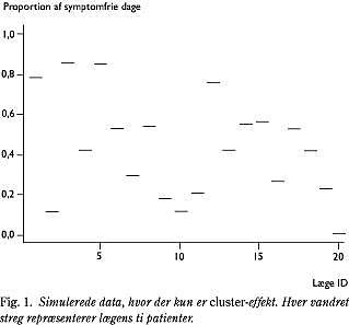 Antag fx at vi vil studere proportionen af symptomfrie dage hos patienter med dyspepsi. Antag nu (hypotetisk) at den enkelte læge behandler alle sine patienter ens, og at de derfor alle har identisk respons (meget hypotetisk). Tydeligvis er det i denne situation nok at kende en enkelt patients respons for hver læge, idet vi da kender udfaldet for alle den pågældende læges efterfølgende patienter. Dette er vist i Fig. 1 , hvor hver enkelt streg viser responsen hos alle den pågældende læges patienter. I dette tilfælde er den sande stikprøvestørrelse antallet af læger, der deltager i studiet, og al variation kan henføres til lægerne.