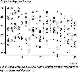 Antag nu modsætningsvis, at lægen ingen indflydelse har på patienternes respons. Nu er det åbenlyst ligegyldigt, om vi inddrager flere patienter hos den samme læge eller udvider forsøget med nye læger og deres patienter. Her er den sande stikprøvestørrelse altså antallet af patienter. Denne situation er præsenteret i Fig. 2 . Cluster -effekt kan altså defineres som fravær af uafhængighed i observationer, der tilhører veldefinerede grupper.
