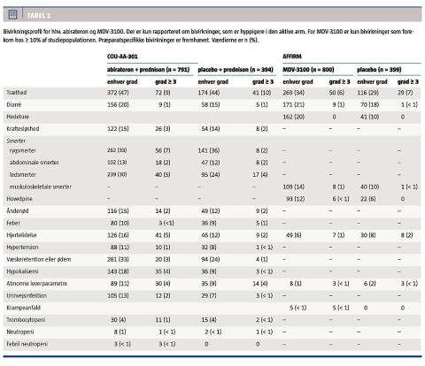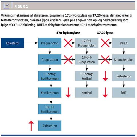 Abirateron er en selektiv hæmmer af CYP17-komplekset (17a-hydroxylase/17,20 lyase/17,20 desmolase), der spiller en afgørende rolle i omdannelsen af kolesterol til androgener (Figur 1) [15]. Abirateron indtages peroralt og blokerer for produktionen af androgener i binyrer, gonader og tumorceller [16]. Blokaden af CYP17-komplekset medfører øget produktion af mineralokortikoider, som er årsag til bivirkninger i form af hypokaliæmi, væskeretention med ødemer og hypertension (Tabel 1). Supplerende behandling med prednison 10 mg dagligt er derfor nødvendig. Efter at være fundet effektiv i fase 1- og 2-studier er abirateron undersøgt i to ens designede randomiserede, dobbeltblindede fase 3-studier [14, 17, 18].