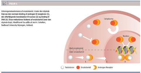 Enzalutamid hæmmer kompetitivt androgenbindingen til AR med større affinitet end tidligere antiandrogener. Herudover inhiberes den nukleære translokation af receptor-ligand-komplekset og bindingen af komplekset til DNA-strengen [19] (Figur 2). I modsætning til andre antiandrogener har enzalutamid ingen påvist agonistisk effekt. Enzalutamid er i fase 1- og 2-studier fundet at have effekt på både præ- og post-kemo-CRPC vurderet ved fald i PSA-koncentration og andre objektive effektmål [19]. Enzalutamid er undersøgt i et fase 3, randomiseret dobbeltblindet studie (AFFIRM) hos patienter med post-kemo-mCRPC [13]. I alt blev 1.199 mænd randomiseret 2:1 til enten enzalutamidkapsler 160 mg dagligt eller placebo. Det primære end point i undersøgelsen var overlevelse. Ved planlagt interimanalyse efter 520 dødsfald blev studiet stoppet, da man fandt en signifikant forskel i medianoverlevelsen på 18,4 mdr. i enzalutamidgruppen mod 13,6 mdr. i placebogruppen. Dette svarer til 37% reduktion i risiko for død til fordel for enzalutamid (p < 0,001). PSA-fald ≥ 50% blev observeret hos 54% af de enzalutamidbehandlede patienter mod hos 2% i placebogruppen. Patienter, der fik enzalutamid, havde signifikant længere mediantid til PSA-progression og radiologisk progression end patienter, som fik placebo, hhv. 8,3 mdr. vs. 3,0 mdr. og 8,3 mdr. vs. 2,9 mdr. Medianbehandlingstiden hos de aktivt behandlede var længere end medianbehandlingstiden hos de patienter, som fik placebo (8,3 mdr. vs. 3,0 mdr.). Bivirkninger ved enzalutamid synes at være lette til moderate (Tabel 1).