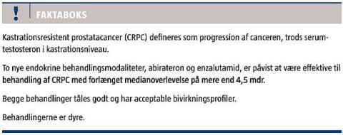 Endokrin behandling af prostatacancer (PC) har været anvendt i mere end 60 år og har stadig en væsentlig plads i behandlingen af patienter med avanceret PC. Hos en voksen mand opretholder androgener celleantallet i prostata og undertrykker apoptose. Hvis den androgene stimulation ophæves, opnås der en dobbeltvirkning: hæmning af DNA-syntese og proliferation samt aktivering af apoptose. Kastrationsbehandling i form af orkiektomi eller behandling med luteinizing hormone-releasing hormone-agonister/-antagonister er standard hos patienter med avanceret PC, men effekten er tidsbegrænset, og såkaldt kastrationsresistent (CR) progression af PC optræder efter 1-2 år [1-3]. CRPC defineres som progression trods serumtestosteron i kastrationsniveau (< 1,7 nmol/l) [4, 5]. Progression hos patienter med CRPC kan være enten stigning i koncentrationen af prostataspecifikt antigen (PSA) eller forekomst af nye metastaser; der foreligger dog ikke konsensus om progressionskriterier.