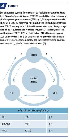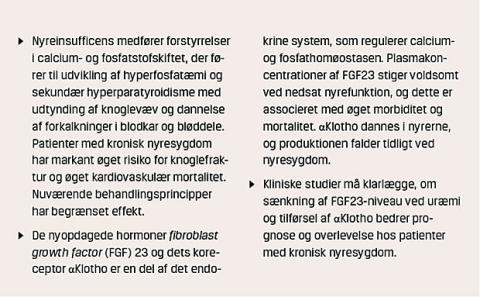 Calcium og fosfat er de hyppigst forekommende mineraler i den menneskelige organisme, og de har essentiel betydning for stort set alle metaboliske processer. Størstedelen af calcium (99%) og fosfat (80%) findes i skelettet i krystallinsk form, hvor de dels indgår som strukturel komponent i knoglevævet, og dels fungerer som buffer for opretholdelse af normale ionkoncentrationer i ekstracellulærvæsken [1]. I ekstracellulærvæsken findes calcium som biologisk aktiv fri ion samt bundet til plasmaproteiner og komplekse forbindelser. Calcium og fosfat reguleres af et kompliceret endokrint netværk bestående af flere hormoner, som opretholder mineralhomøostasen ved at regulere absorption i tarmen, udskillelse i nyrerne og knogleaktivitet [1]. Opdagelsen af fibroblast growth factor (FGF) 23 og dens koreceptor αKlotho har grundlæggende ændret forståelsen af det endokrine system, der regulerer mineralhomøostasen samt patogenesen ved mineral- og knogleforstyrrelsen ved nyresygdom [2].