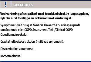 Ved vurdering af en patient med KOL, bør der altid foreligge en dokumenteret vurdering af symptomer, grad af luftvejsobstruktion, eksacerbationsanamnese, komorbiditet og risiko.