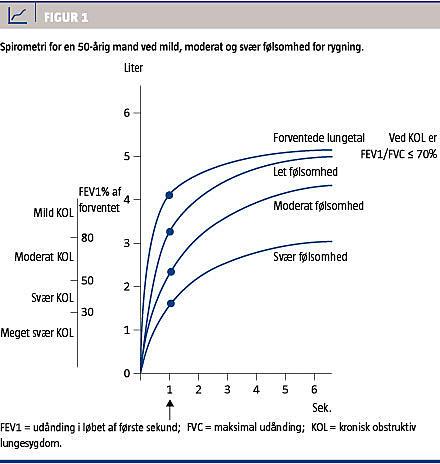 Spirometri er nødvendig for at stille diagnosen KOL. En postbronkodilatatorisk udånding i løbet af første sekund (FEV1)/maksimal udånding (FVC) < 70% bekræfter tilstedeværelse af persisterende luftvejsobstruktion [6]. Som alternativ til den fikserede FEV1/FVC-ratio på 70% kan man benytte den nederste aldersjusterede normalgrænse [7] for at undgå over- og underdiagnostik af KOL hos henholdsvis yngre og ældre.
