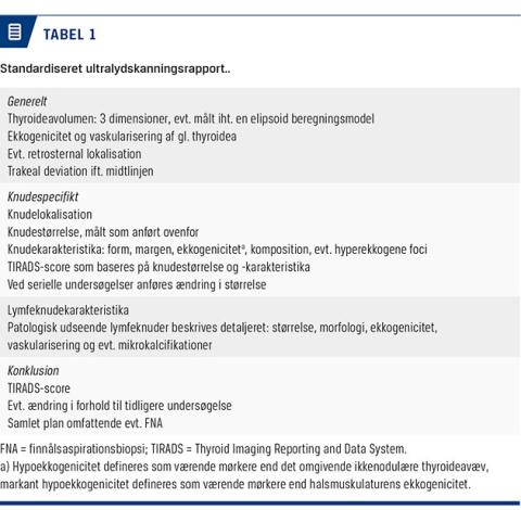 UL-skanning er vigtig i den initiale udredning af en scintigrafisk kold knude i glandula thyroidea. Med baggrund i en ny europæisk guideline og en tilsvarende national behandlings¬vejledning foreslås det, at danske radiologer, endokrinologer, øre-, næse- og halslæger samt kliniske fysiologer anvender nærværende TIRADS-scoringssystem for at standardisere rapporteringen og øge reproducerbarheden af UL-skanningsbeskrivelsen af knuder i glandula thyroidea [9]. De nye anbefalinger kan potentielt betyde en mere omkostningseffektiv tilgang med en mere selektiv udvælgelse af de knuder, der anbefales biopteret. F.eks. kan man undlade FNA ved en påvist cyste.
