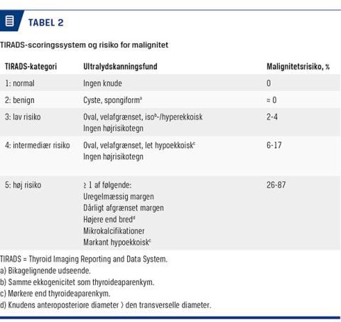 Vi anbefaler, at der anvendes en standardiseret rapport til UL-skanningsbeskrivelse af glandula thyroidea omfattende en TIRADS-score (Tabel 1). Med et scoringssystem baseret på UL-skanning kan man således klassificere knuder som benigne eller henholdsvis lav-, intermediær- og højrisikoknuder med tilhørende anbefaling af, om FNA bør foretages eller kan undlades [2, 5-7, 10-12] (Tabel 2). Nedenfor er de enkelte TIRADS-kategorier forklaret.