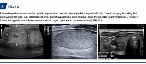 I denne artikel præsenterer vi en mere systematisk måde til beskrivelse af UL-skanning af den scintigrafisk kolde knude i glandula thyroidea, og vi foreslår, hvornår biopsi bør foretages. Thyroideacancer har vist en stigende forekomst, således var den aldersjusterede incidensrate 1,6 pr. 100.000 i 1980 og 4,5 pr. 100.000 i 2014 [1]. I 2016 blev der i den danske thyroideacancerdatabase (DATHYRCA; www.dahanca.oncology.dk) registreret 319 nye tilfælde mod 265 i 2013. Dette skal sammenholdes med en meget høj forekomst, som skønnes at være > 5% af palpable knuder i glandula thyroidea, såvel som en hyppig forekomst af tilfældigt påviste knuder pga. en stigende anvendelse af billeddannende undersøgelser udført på en ikkethyroidearelateret indikation [2, 3]. I Danmark blev der i 2017 udført ca. 6.000 finnålsaspirationsbiopsier (FNA), hvilket afspejler en betydelig diagnostisk aktivitet for at identificere de relativt få personer, som har cancer. Der er derfor behov for en omkostningseffektiv tilgang, hvilket indebærer, at udredning af knuder i glandula thyroidea med fordel varetages af læger med kompetencer inden for UL-skanning af glandula thyroidea.