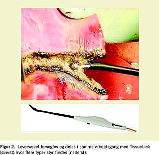 To nyere forseglingsteknikker, baseret på radiobølger præsenteres (Figur 1 og Figur 2 ). Samme teknik har i flere år været anvendt til lokal destruktion af metastaser i bl.a. lever, lunger og nyrer eller til tumorfjernelse ved cancer mammae, den såkaldte radiofrekvensablation (RFA). RFA-energi forårsager skrumpning af kollagen og derved fusion af mindre kar og galdegange, hvis lumina derved oblitereres permanent [6, 7]. I princippet varmes levervævet langsomt op langs den planlagte resektionslinje, således at vævet med kar og galdegange forsegles inden deling. Herved reduceres eller undgås blødning og galdelækage fra resektionsfladen. Til operativ leverkirurgi er der udviklet to forskellige, kommercielt tilgængelige typer udstyr med hver deres udformning og anvendelse. Begge typer af udstyr kræver specielle styr/håndtag og nåle. Det ene system kræver en særlig RFA-generator, mens det andet kan kobles til flere almindelige elkirurgiske generatorer. Forseglingen af levervævet rummer flere fordele, idet leveren kan deles uden samtidig afklemning af gennemblødningen fra vena portae og arteria hepatica (Pringles manøvre), hvorved man helt undgår iskæmi af restleveren. Ligeledes kan der foretages tumorexcisioner, dvs. mere lokale, ikkeanatomiske resektioner, eller resektioner på tværs af leversegmenter. Dette sparer sundt levervæv i forhold til de klassiske, anatomiske leverresektioner, hvor man følger levervenerne eller segmenterne (pedikelkirurgi) og fjerner større funktionelle enheder i leveren. Teoretisk set kan flere tumorer eller metastaser fjernes uden frygt for efterfølgende levercoma, og flere patienter ville kunne være kandidater til radikal kirurgi.