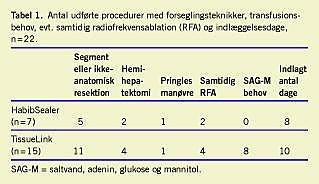 Materiale og metoder: Der blev foretaget en retrospektiv analyse af 22 patienter, der var i alderen 60-71 år og var blevet henvist til behandling af synkrone eller metakrone levermetastaser efter kolorektal cancer og i 2006 var blevet opereret med forseglingsteknikker. To nyere typer udstyr, baseret på radiobølger, blev anvendt, enten Habib Sealer eller TissueLink. Transfusionsbehov og operationsdata, herunder transfusionsbehov og komplikationer blev opgjort.