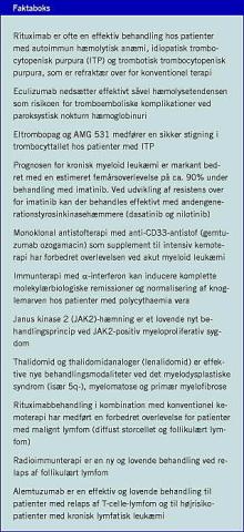 Monoklonal antistofterapi herunder brug af bl.a. anti-CD20-antistof (rituximab), anti-CD52-antistof (alemtuzumab) og anti-CD33-antistof (gemtuzumab og ozogamacin) er i dag integreret i behandlingen af patienter med malignt lymfom, kronisk lymfatisk leukæmi og akut myeloid leukæmi. Herudover anvendes rituximab i behandlingen af refraktær autoimmun hæmolytisk anæmi, idiopatisk trombocytopenisk purpura og ved relaps af trombotisk trombocytopenisk purpura. Nye signaltransduktionshæmmere, dasatinib og nilotinib, anvendes i behandlingen af patienter, der har kronisk myeloid leukæmi og udvikler resistens over for imatinib. Thalidomid, lenalidomid og bortezomib har alle vist sig at være effektive ved myelomatose, og Janus kinase 2 (JAK2)-inhi-bitorer afprøves p.t. i fase II-studier med patienter med JAK2-positiv primær myelofibrose og beslægtede sygdomme.