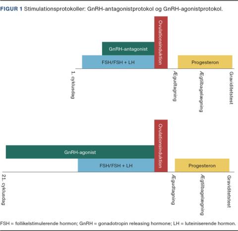 Protokolvalget er afgørende for risikoen for udvikling af OHSS. Den klassiske stimulationsprotokol er den lange gonadotropin releasing hormone agonist (GnRHa)-protokol, hvor kvinden først forbehandles med GnRHa i ca. 14 dage, inden gonadotropinstimuleringen (follikelstimulerende hormon, follikelstimulerende hormon/luteiniserende hormon) påbegyndes. De senere år har gonadotropin releasing hormone antagonist (GnRH-ant)-protokollen, også kaldet kort protokol, vundet indpas. Behandling med GnRH-ant indebærer både en kortere behandlingstid, et lavere forbrug af hormoner til stimulering og signifikant færre bivirkninger (Figur 1). Frem for alt er OHSS-risikoen ved brug af den korte protokol reduceret med ca. 50% (odsratio: 0,61, 95% konfidens-interval (KI): 0,51-0,72) [7], mens fødselsraterne er de samme som ved brug af den lang GnRHa-protokol (oddsratio = 1,02, 95% KI: 0,85-1,23) [9].