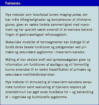 Summary Novel methods for the assessment of sensory, biomechanical and motor functions of the gastrointestinal tract Ugeskr Læger 2009;171(14):1178-1182 The article gives a review of new methods in gastroenterology. The »functional lumen imaging probe« is a method used to evaluate the competence of sphincter regions during distension. The axial force probe can measure forces in the oesophagus during swallowing and give new information about patients with motor disorders of the oesophagus. The »multimodal probe« measures the sensory response to electrical, mechanical, thermal and chemical stimuli. Together with advanced modeling of the brain activity, these methods have increased our knowledge about the pathogenesis of sensory symptoms.