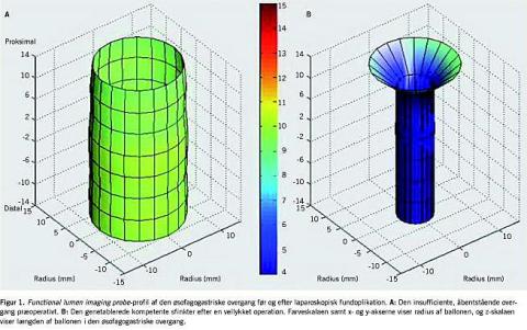 Den øsofagogastriske overgang (OGO) består af flere komponenter: 1) den glatte muskulatur i sphincter oesophagi, 2) crura diaphragmatica, 3) den intraabdominale lokalisation af overgangen i et lavtryksområde, 4) det frenoøsofageale ligament og 5) den snævre His' vinkel, som sikrer en klapfunktion. Selve kontrollen med åbne- og lukkefunktionen er underlagt en kompleks neurofysiologisk kontrol, og givet de ovenstående faktorer er det selvsagt vanskeligt at måle funktionen af OGO. Sygdomme som gastroøsofageal refluks er særdeles hyppige i befolkningen og er i høj grad relateret til en dysfunktion af OGO. Den klassiske behandling af refluks er hæmning af ventriklens syreproduktion med protonpumpehæmmere, men hvis dette er utilstrækkeligt, kan man tilbyde endoskopisk og kirurgisk behandling (typisk som laparoskopisk fundoplikation), hvor lukkefunktionen af OGO forbedres. Effekten og bivirkningsfrekvensen af disse tiltag er afhængig af, i hvor høj grad og på hvilken måde OGO forsnævres. Det er derfor af største vigtighed at have metoder, som kan måle på lukkefunktionen. Man har tidligere anvendt manometriske målemetoder. Imidlertid er der en række begrænsninger ved manometri, som bl.a. relateres til, at de fleste sfinkterregioner virker som en slags ventiler, som principielt kan være lukkede uden, at der kan måles et tryk [1]. Functional lumen imaging probe (FLIP) er en ny modalitet, som måler en række tværsnit i en cylindrisk ballon, mens den fyldes aktivt i OGO [1] - Figur 1. Hermed måles kompetencen af OGO, når den udvides. En »distensibilitetstest« vil således give information om åbne- og lukkedynamik i stedet for at vurdere den statiske sfinktertonus som ved manometri. Profilerne har været anvendt til at vurdere sfinkterregionen under farmakologisk, endoskopisk og kirurgisk behandling af OGO.