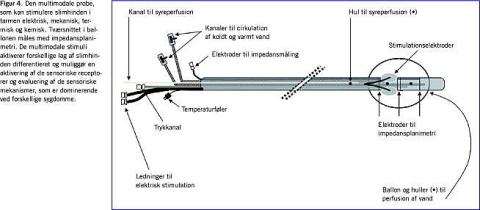 Mellem 20% og 40% af befolkningen er periodevis eller konstant generet af symptomer, som kan relateres til mave-tarm-kanalen. Symptomer fra de indre organer er diffuse og ledsagede af autonome reflekser og meddelte smerter til andre organer og somatiske strukturer. Mekanismerne bag disse symptomer er tidligere beskrevet i Ugeskrift for Læger [5]. Da kroniske smerter også er ledsaget af forskellige psykosociale symptomer, medicinering m.v. gør alle disse konfoundere diagnosticering og behandling vanskelig. For at omgås vanskelighederne i den kliniske situation kan man anvende eksperimentelle smertemodeller. Fordelen ved disse er, at man kan kontrollere omstændighederne under forsøget. Således kan man styre smertestimulusintensitet, modalitet, frekvens, sted osv., og man kan måle det sensoriske respons med validerede skalaer, billeddiagnostiske eller neurofysiologiske metoder [6]. Disse modeller har været meget anvendte i hud og muskler, men lokalisationen af organerne har gjort stimulering af mave-tarm-kanalen vanskelig, og oftest har metoderne ikke været valide [6]. Yderligere vil har man gerne villet undersøge effekten af en række forskellige smertestimuli, som kan aktivere forskellige nerver og smertemekanismer. Der er derfor udviklet en metode til »multimodal« stimulering af mave-tarm-kanalen - Figur 4. Det biomekaniske stimulus kan kontrolleres, idet man ved en elektrisk metode måler tværsnittet af ballonen, og herved kan udvidelsen (som aktiverer mekanoreceptorer i lamina muscularis) måles. Desuden gives elektriske stimuli med elektroder, der er placeret på ballonen. Samtidig måles impedansen mellem elektroderne for at sikre kontakten. Man kan også recirkulere koldt og varmt vand i ballonen og derved give termiske stimuli ved hjælp af en computerstyret pumpe. Endelig kan man anvende kemiske stimuli ved at perfundere slimhinden med 0,1 M saltsyre ± capsaicin (den aktive komponent i chilipeber). Den kemiske stimulering anvendes væsentligst til at efterligne kliniske situationer med aktivering af inflammationskaskaden. I de nyeste versioner er der indbygget en kanal, hvor man kan indsætte et tyndt endoskop, hvilket muliggør inspektion af slimhinden og evt. bioptering.