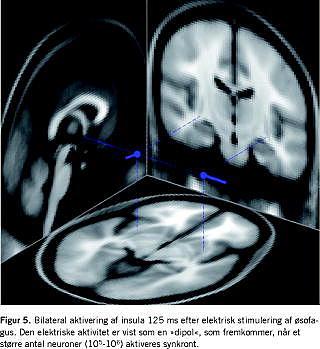 Man kan måle det sensoriske respons med validerede skalaer, men da f.eks. smerte er et overordnet begreb, som indeholder information om tid, sted, kvalitet og styrke - foruden affektive og kognitive komponenter - er disse skalaer udtryk for den subjektive opfattelse af et meget komplekst fænomen. Hvis den successive aktivering af de forskellige dele af det perifere og centrale nervesystem skal forstås mere detaljeret, må man anvende metoder, som giver en detaljeret information om nervesystemet. For at opnå denne information kan man bruge billeddiagnostiske og neurofysiologiske metoder. Metoder, der er baseret på billeddiagnostik, er begrænsede af, at processeringen af smerter gennem forskellige centre i hjernen foregår inden for få millisekunder. Hvis man skal opnå en forståelse for, hvilke centre der er aktive i den ascenderende aktivering af neuroaksen, må man derfor måle den neuronale aktivitet direkte. De fleste steder anvendes elektroencefalografi (EEG) eller magnetencefalografi. Sammenlignet med magnetencefalografi er EEG-signalet fra de neuronale strukturer forvrænget af bl.a. hud og knogle, men det har den fordel, at man kan måle den dybe hjerneaktivitet, og udstyret er billigere. De tekniske problemer kan i stor udstrækning løses med signalanalytiske metoder. Den moderne computerteknik har gjort analyse af store datamængder mulig og har bidraget til at løse »det inverse problem« - dvs. at beregne hjernenaktiviteten baseret på den elektriske aktivitet målt i hovedbunden. Typisk kombinerer man sin matematiske model med en MR-skanning af personens hjerne, så individuelle forskelle i anatomi ikke begrænser beregningerne. Der findes forskellige modeller til at løse det inverse problem, men det har for nylig vist sig, at hvis man opløser signalet i individuelle bølgeformer, kan man beregne lokalisationen af det aktive center i hjernen med en nøjagtighed på få millimeter - og i realtid - Figur 5 [9]. Man har bl.a. anvendt sådanne metoder til at sandsynliggøre, at smerterne ved kronisk pancreatitis er af neurogen oprindelse [10]. Det er også vist, at hjernens bearbejdning af smerter hos patienter med funktionelle tarmsygdomme som f.eks. colon irritabile minder om dem, man kan fremkalde hos raske, når øsofagus sensibiliseres med syre. Disse ændringer kan måske forklare den allodyni, der er et kendetegn ved mange af disse patienter, og som kan manifestere sig ved smerter ved normal afføring og luft i tarmen.