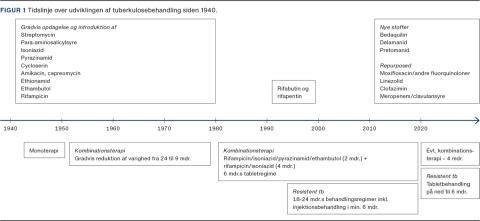Siden 1980’erne har man for antibiotikafølsom tb benyttet en standardbehandling bestående af en tomånedersinduktionsfase med rifampicin, isoniazid, ethambutol og pyrazinamid, efterfulgt af fire måneders kontinuationsfase med rifampicin og isoniazid (Figur 1). I bestræbelserne på at forbedre adhærence og reducere toksicitet har der i mange år været et ønske om at forkorte behandlingsvarigheden. Nogle af de »nye« lægemidler, som man håbede på, var især fluorquinoloner (moxi- eller levofloxacin), og man forsøgte sig med højere doseringer af rifampicin. Det var derfor en skuffelse, at det stort anlagte »muliticenterRemoxstudie«, som inkluderede begge disse komponenter, ikke viste sig effektivt – særligt pga. højere relapsrater [12]. I 2021 offentliggjordes overraskende resultater fra et klinisk studie, hvor rifamycinpræparatet var rifapentin i de to interventionsgrupper – og moxifloxacin var inkluderet i stedet for ethambutol i initiationsfasen og som tillæg i kontinuationsfasen i en af interventionsarmene. Behandlingsregimentet med otte ugers initiationsfase med rifapentin, isoniazid, pyrazinamid og moxifloxacin efterfulgt af ni ugers kontinuationsfase med rifapentin, isoniazid og moxifloxacin var noninferiort til den traditionelle seksmåneders behandling, mens alvorlige bivirkninger var lige hyppige [13].