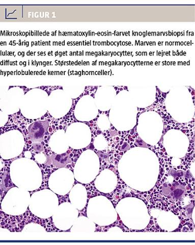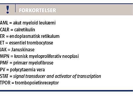 Essentiel trombocytose (ET) (Figur 1), polycytaemia vera (PV) og primær myelofibrose (PMF) (Figur 2) repræsenterer de klassiske myeloproliferative neoplasier (MPN). Det er hæmatologiske kræftsygdomme, som udgår fra knoglemarvens stamceller. Kendetegnet ved sygdommene er en autonomt hyperprolifererende knoglemarv, som resulterer i overproduktion af en eller flere af blodets modne celler. Klinisk ses en øget risiko for tromboemboli og/eller blødninger, samt varierende symptomer fra mikrocirkulationen, hypermetabole symptomer og hudkløe. PV og ET kan progrediere til post-PV- eller post-ET-myelofibrose, og alle tre typer MPN kan progrediere til akut myeloid leukæmi (AML) [1]. Allerede i 1951 introducerede Dameshek konceptet om et nært slægtskab mellem de tre sygdomme [2], hvilket molekylærbiologisk blev bekræftet i 2005 ved identifikationen af V617F-mutationen i JAK2 hos 98% af patienterne med PV og ca. 50% af patienterne med ET og PMF [3]. Mutationen medfører en ændring af valin til fenylalanin i kodon 617, hvorfor mutationen benævnes JAK2-V617F. JAK2 koder for Januskinase (JAK) 2, en proteinkinase, som aktiveres af bl.a. erytropoietinreceptoren og trombopoietinreceptoren (TPOR). JAK2-mutationen resulterer i en liganduafhængig aktivering af JAK2, der aktiverer nedstrømscellulære signalveje, bl.a. signal transducer and activator of transcription (STAT), der inducerer celleproliferation [1, 4]. Fundet af JAK2-mutationen har bidraget med ny viden om patofysiologien og patogenesen bag MPN samt forenklet diagnostikken, som tidligere beskrevet i Ugeskrift for Læger [5]. Diagnosticering af JAK2-negativ ET og PMF har pga. fraværet af klonale markører været en udfordring. Formålet med denne artikel er at beskrive de senere års nye molekylærbiologiske landvindinger inden for sygdomsgruppen, herunder bl.a. MPL-mutationen og det seneste molekylærbiologiske gennembrud – identifikationen af mutationer i calretikulin-genet (CALR).