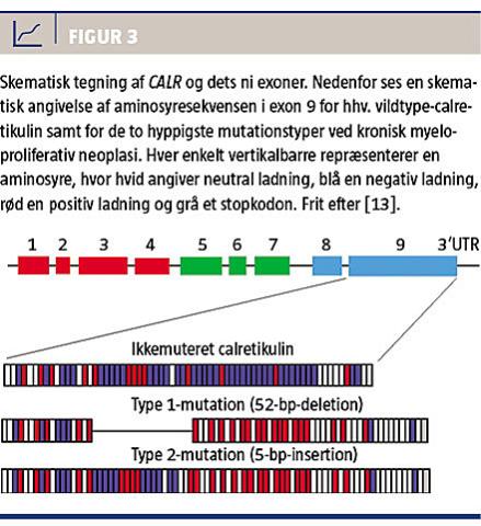 CALR-mutationerne ved MPN er alle somatiske mutationer, som er lokaliseret til exon 9 (Figur 3), der koder for den sure C-terminal. Mutationerne introducerer et skift i proteinets læseramme, hvilket medfører tab af ER-retentionssignalet og en ændring af C-terminalens surhedsgrad, så denne bliver mere basisk [11]. Indtil videre er der beskrevet 41 forskellige mutationer – de fleste insertioner eller deletioner og enkelte komplekse rearrangementer [12]. Størstedelen af mutationerne – 50-80% – udgøres af en 52-bp-deletion (type 1) eller en 5-bp-insertion (type 2). Type 1 medfører tab af alle negativt ladede aminosyrer i C-terminalen, og type 2 medfører tab af halvdelen [11].