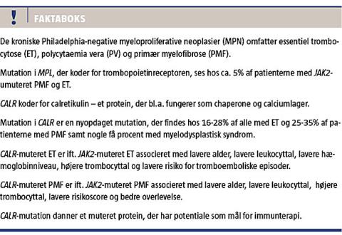 CALR-mutation er en ny vigtig sygdomsmarkør for MPN, og i Danmark er den allerede implementeret rutinemæssigt som led i udredningen for MPN. CALR-mutationsstatus har for PMF vist sig at være af prognostisk værdi, især kombineret med mutationsstatus for ASXL1. CALR-muteret ET og PMF adskiller sig klinisk fra JAK2-muteret sygdom og kan overordnet karakteriseres som værende mere indolent. Muteret CALR som mål for immunterapi er en teoretisk mulighed, som potentielt åbner nye perspektiver i forhold til behandling af MPN.