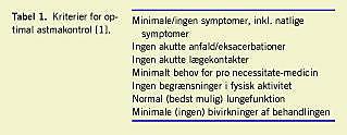 Behandlingsmålet er her opfyldelse af alle kriterierne for god astmakontrol iht. GINA-guidelines (Tabel 1) [1]. Behandlingsprincippet er belyst i en kontrolleret undersøgelse (n = 3.421) [3], hvor patienterne blev randomiseret til ICS og langtidsvirkende β2-agonist (LABA) eller ICS alene i 12 måneder. Dosis af ICS blev løbende optrappet indtil optimal kontrol eller maksimal dosis ICS (fluticason 1 mg pr. dag) i første del af undersøgelsen, og i anden del af undersøgelsen var ICS-dosis konstant. I de to behandlingsarme blev gennemsnitligt 72% af patienterne behandlet med maksimal dosis ICS i anden del af undersøgelsen, og behandlingen blev ikke efterfølgende nedtrappet.