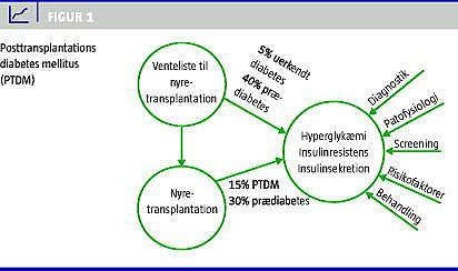 Hver sjette patient, der ikke på forhånd har diabetes, får det i tilslutning til nyretransplantation (posttransplantations diabetes mellitus, PTDM). PTDM ligner på mange måder type 2-diabetes mellitus, men har alligevel krævet særlig opmærksomhed. Trods massiv overvågning og opfølgning overses PTDM ofte til sent i forløbet. En del patienter møder endog frem til transplantationen med udiagnosticeret diabetes, hvilket vi har påvist gennem undersøgelser af en gruppe patienter, der stod på Scandiatransplants venteliste. Det viste sig, at ca. 5% af patienterne havde udiagnosticeret diabetes, og omkring 30% havde nedsat glukosetolerans eller øget fasteblodsukker (10%) [1]. Situationen er derfor den, at man i forbindelse med transplantation dels nydiagnosticerer diabetes før indgrebet, dels udsætter patienterne for et kirurgisk stress og intensiv immunsuppressiv behandling, der i de fleste tilfælde også omfatter steroider. Derved skubbes yderligere 15% ud i en egentlig diabetes (Figur 1 ), og man kan vha. nyere opgørelser konstatere, at man ikke i tilstrækkelig grad har været opmærksom på denne udvikling, hverken under indlæggelsen eller ved de efterfølgende ambulante kontroller [2]. Der har således været et betydeligt antal transplanterede patienter, der har haft lettere grader af type 2-diabetes og i længere perioder har været udiagnosticerede og ubehandlede [3]. Det er uhensigtsmæssigt, fordi det klart er påvist, at PTDM er associeret med øget risiko for kardiovaskulær sygdom og død [4, 5].