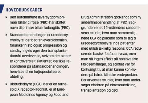 Sygdommen PBC har skiftet navn fra primær biliær cirrose til primær biliær kolangitis, og forkortelsen PBC er derfor uændret. Den primære behandling til patienter med PBC er UDCA, der forsinker sygdomsprogression og sandsynligvis bedrer den transplantationsfri overlevelse. OCA, der er en potent FXR-agonist, har vist lovende resultater i et fase 3-studie med bedring i leverbiokemi hos knap halvdelen af de patienter, der ikke responderede på UDCA, men der var ingen effekt på fibroseudvikling i en 12-måneders observationsperiode; livskvaliteten var signifikant værre på grund af hudkløe, der er en kendt bivirkning af OCA. Man afventer data for hårde endemål i form af cirroseudvikling, levertransplantation og død. Patienter, der ikke responderer på standardbehandling, henvises til højtspecialiserede centre. Fibrater anses ligeledes for at være en potentielt lovende behandling i fremtiden.