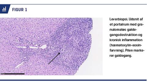 Mistanke om PBC opstår typisk ved fund af vedvarende forhøjet basisk fosfataseniveau i forbindelse med rutinekontrol af blodprøver (ved praktiserende læge), mindre hyppigt ved uforklarlig kløe og træthed [5]. Diagnosen kan stilles, hvis en patient opfylder to af de tre flg. kriterier: 1) Vedvarende forhøjet basisk fosfataseniveau i seks måneder uden anden kendt årsag, 2) forhøjet mitokondrieantistoftiter (AMA), som ses hos ca. 90% af patienterne, og 3) leverbiopsi med forandringer, der er forenelige med PBC, i form af portal lymfocytær inflammation ledsaget af granulomer (Figur 1) [5]. Ved PBC opdeles de histologiske forandringer i fire stadier: 1 = portal hepatitis, 2 = periportal hepatitis,