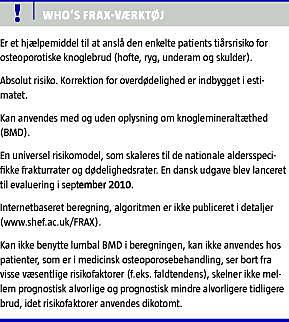 Summary New online tool for assessment of the risk of osteoporotic fractures Ugeskr Læger 2011;173(19):1349-1352 The decision to initiate anti-osteoporotic treatment in Denmark relies on the presence of risk factors combined with a low bone mineral density or on previous low energy fracture, but does not take into account factors like residual life expectancy or the complex relationship between age, bone mineral density and risk factors. The WHO FRAX tool estimates the ten-year risk of osteoporotic fractures by superimposing national fracture and mortality rates on a generalized risk model derived from large studies. As a version adapted for Denmark has now become available, we discuss the strengths and limitations and the impact on clinical decision-making and health policy.