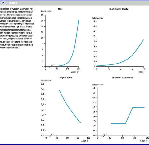 Inddelingen af risikofaktorer er ret groft kalibreret. Der skelnes således ikke mellem den anatomiske lokalisation af tidligere brud, og der tages ikke højde for, om de er af ny eller af ældre dato. Begge disse forhold har betydning for frakturrisikoen [5, 6]. Risikomodellen er på nogle områder en oversimplificering - der anvendes en dikotom risiko for mange variable, selv om en »dosis-effekt« er dokumenteret (Figur 1 ). Tilsvarende indgår »sekundær osteoporose" som ja/nej. Det betyder, at patienter med f.eks. samtidig tidlig menopause og tyreotoksikose tildeles samme risiko som patienter med den ene af tilstandene. Endvidere er antallet og sværhedsgraden af tidligere vertebrale frakturer stærkt relateret til risikoen for ny fraktur [7], men i FRAX kan man ikke angive antal, men alene tilstedeværelse eller fravær af tidligere knoglebrud.