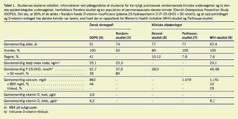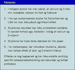 I kontrollerede kliniske undersøgelser [1-3] og metaanalyser [4, 5] har man påvist, at et tilskud af kalk og D-vitamin reducerer risikoen for fald og frakturer. De fleste af undersøgelserne er udført hos ældre D-vitamin-insufficiente personer, der boede på plejehjem eller i beskyttet bolig [1, 5], men enkelte er udført hos hjemmeboende ældre [2, 3]. Referencer til supplerende relevante kontrollerede kliniske undersøgelser fremgår af metaanalysen [5]. I en dansk klyngerandomiseret undersøgelse, der omfattede hjemmeboende i Randers, påviste man således, at et tilskud på 10 μ g D-vitamin og 800 mg calcium reducerede risikoen for frakturer med 16% [3]. I 2005 blev der imidlertid publiceret to populationsbaserede engelske undersøgelser [6, 7], hvori man ikke havde kunnet påvise signifikant effekt af 1.000 mg calcium og/eller 20 μ g (800 IE) D-vitamin pr. dag. Endelig blev Women's Health Initiative's overvejende negative interventionsundersøgelse [8] offentliggjort i 2006. Der blev her ikke fundet nogen signifikant reduktion i frakturrisikoen af 1.000 mg calcium og 10 μ g D-vitamin dagligt i syv år. Man fandt imidlertid, at tilskuddet af calcium og D-vitamin øgede risikoen for nyresten. Disse tre studier har medført en diskussion af det fornuftige i fortsat at anbefale et tilskud af D-vitamin og evt. calcium til ældre over 60-65 år for at forebygge lavenergifrakturer.