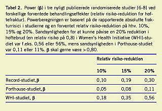 I studiepopulationen var calciumindtaget typisk > 1 g pr. dag. Knap 50% havde et D-vitamin-indtag > 10 μ g pr. dag, 40% fik samtidig hormonbehandling, > 50% var overvægtige, og kun 8% var rygere (Tabel 1 ). Desuden tog 10,7% alendronat, 1,8% risedronat, 3% raloxifen og 1,2% calcitonin. Disse forhold medførte, at der kun var halvt så mange hoftefrakturer som forventet i studiet. Man havde estimeret en power på 85% til at påvise en forskel på 18% i hoftefrakturrisiko over otte år. Baseret på det faktuelle antal frakturer over syv år skulle man imidlertid med en power på 80% have inkluderet 325.829 personer for at kunne påvise en 10% forskel, 141.396 for at kunne påvise en 15% forskel og 77.614 for at kunne påvise en 20% forskel. Til trods for det store antal deltagere havde studiet således for lille statistisk power (Tabel 2 ).