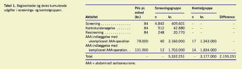 Tabel 1 viser omkostningerne bag begivenhederne. Den totale forskel på de to grupper var 2.155.251,30 kr. svarende til 340 kr. pr. inviteret person. I screeningsgruppen døde ni af patienterne med AAA, og i kontrolgruppen døde 27, hvilket svarer til en hazard ratio på 0,33 (95% KI: 0,16-0,71; p = 0,003). Altså 67% lavere AAA-relateret dødelighed i den inviterede gruppe med en omkostning på 119.733 kr. (95% KI: 95.600-173.527) pr. forebygget dødsfald.